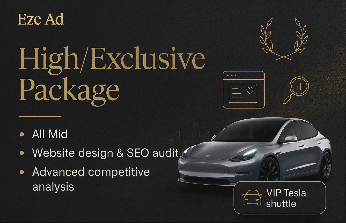 Perfect for startups needing a strong digital foundation. ● Content Creation: 1 day/week filming at your facility, producing 5 SEO-captioned contents (videos, reels, posts) for Meta (FB/IG). ● Social Media Management: 5 days/week posting + daily story reposts to dominate niches like “Miami beauty salon SEO.” ● VIP Tesla Rides: Free pick-up/drop-off with in-car ad display on built-in screen. 6-month minimum, two payments. Ideal for organic growth.